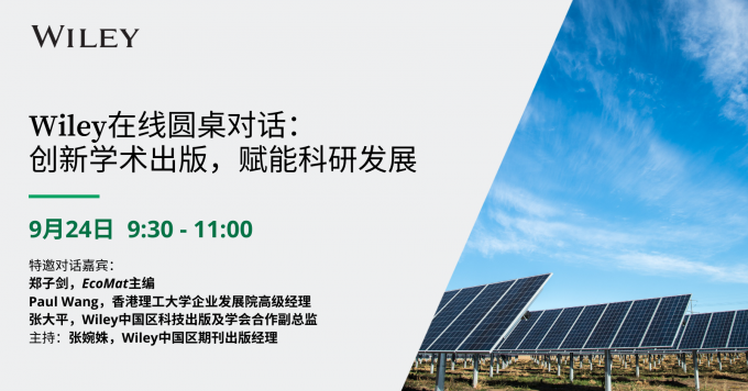 由中国科协主办的第十六届中国科技期刊发展论坛云展览将于9月24-25日在线上展开。作为本次展览的主题平行活动,Wiley将于9月24日上午举办聚焦“合作期刊创新发展”的线上圆桌对话。本次活动特别邀请到Wiley与香港理工大学合作出版期刊EcoMat主编郑子剑教授,香港理工大学企业发展院高级经理Paul Wang先生与Wiley中国区科技出版及学会合作副总监张大平博士展开对话。共同探讨学术期刊赋能科研及科技创新发展的新前景和新机会,并就如何促进更公平、更有效、更强责任感的研究及创新环境等议题分享其观点及经验,在线与观众进行交流。